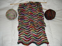Okay. Here is my own version of the Chevron scarf. I did not have the pattern that everyone is making, so I grabbed a Barbara G Walker stitch pattern book (A Treasury of Knitting Patterns) and made one up, based on the pattern "Feather and Fan Stitch or Old Shale" on page 205. This is a lacy eyelet chevron, and I omitted the eyelets, and decided each wave should be 6 stitches long, and that the pattern should evolve over the 4 rows that the original pattern does. So here it is: